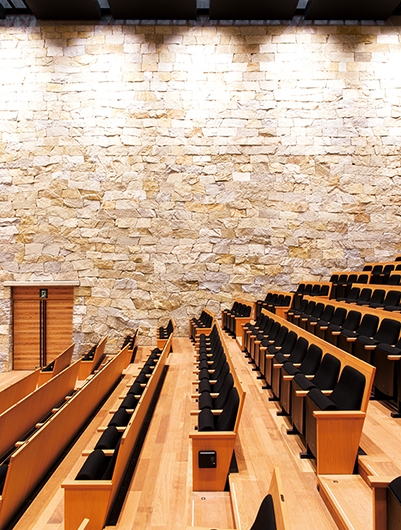 旧市民会館の老朽化により、耐震などの観点から建て替えが計画され、中心市街地に観音寺市民会館が誕生しました。大・小ホールと多目的ホールで構成され、観音寺市民の新たな文化芸術の拠点となることを目指しています。大ホールの内装は、観音寺市の「ちょうさ祭り」の太鼓リズムを想起させる柱配置として木をふんだんに使用し、内装の意匠に合わせて座席にも杉材を採用しています。小ホールの壁面は、香川県産の庵治石(あじいし)を用いた石積壁で、国内外でも珍しいホールとなっています。