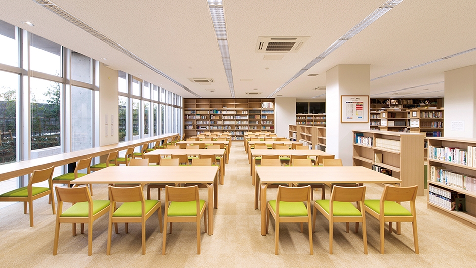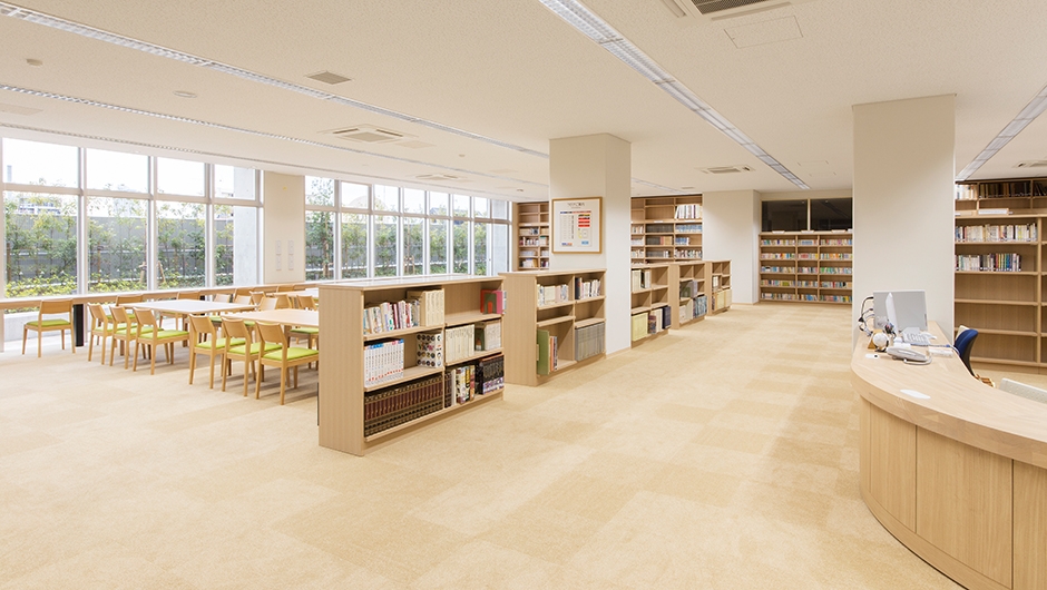 南館1階の図書室は、新しく木製の書架やテーブル・イスが用意され、木の温もりが感じられる明るい空間となっています。