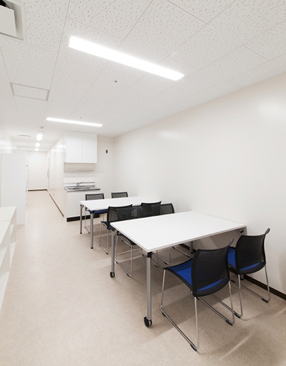 1階 スタッフルーム/イス:ルッシュ、テーブル:DTN、事務デスク、収納庫、ロッカー、掲示板