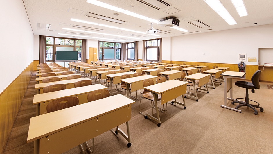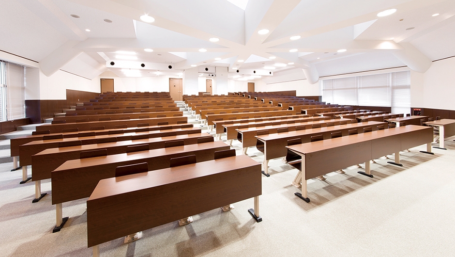 本館1301教室は、約300名を収容できる大教室で、この度、改修を行ないました。デスク・イスの木部カラーや脚部カラーなどは既存家具の意匠を継承し、インテリアのイメージはそのままに家具を新しくしています。