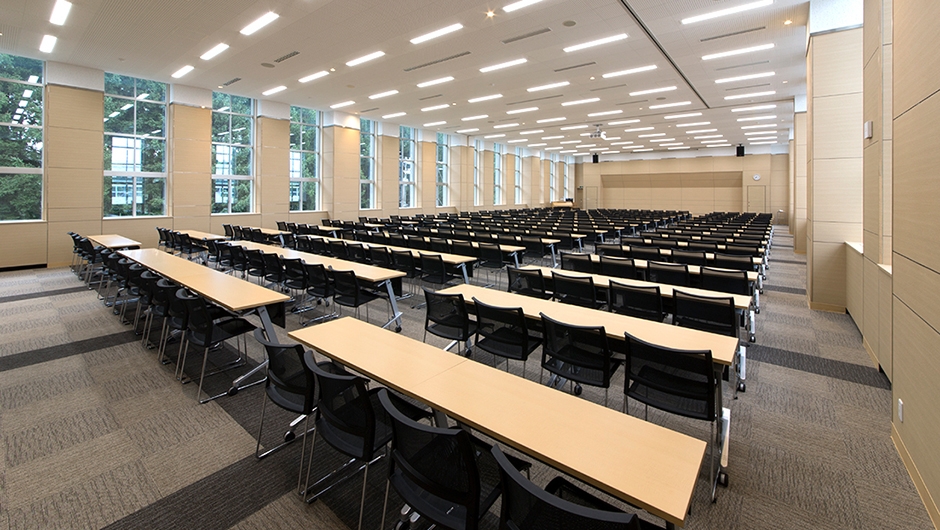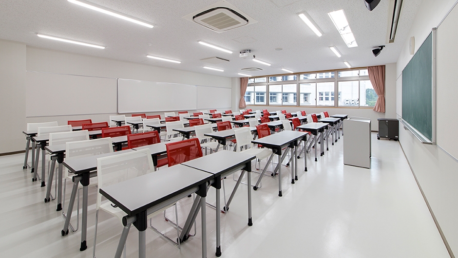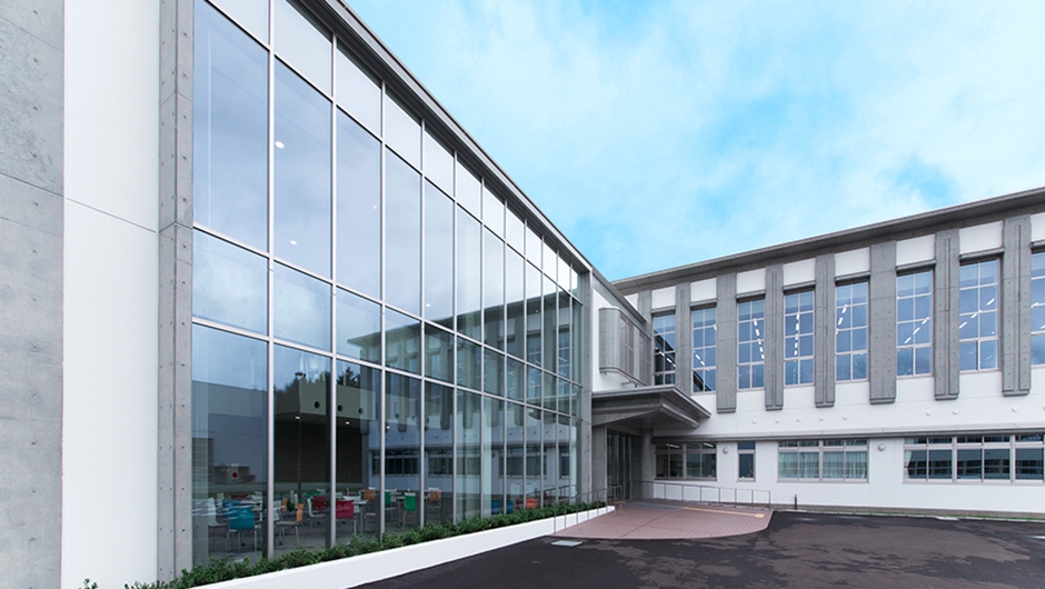 平成28年9月に竣工した新校舎は、約400人収容の「アクティブホール」を初め、講義室、演習室、保健室、相談室など、勉学と学生生活を快適にするための施設が設置されています。既存校舎連絡通路とエントランスとの間にあり、多くの学生が行き来する学生ラウンジは、2層吹き抜けの大きなガラス面を持つ開放的な大空間となっており、学生のくつろぎと交流の場として期待されています。尚、当校舎と学生ラウンジの愛称「スチューデントホール」「岩姫ラウンジ」は、学内と卒業生からの応募で選ばれました。