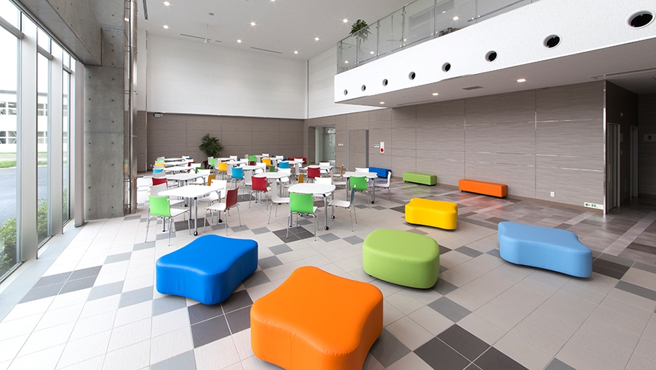 1階 学生ラウンジ「岩姫ラウンジ」/イス、テーブル:DTN、スツール:DECO・BOCO、JELLY-STICK