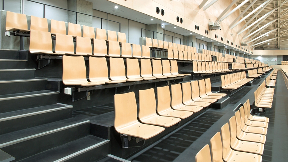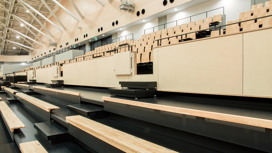 メインアリーナ/1階席 移動観覧席「テレスコープスタンド」:AHP-A8200-30特注品 1152席(288席×4ブロック)、2階席 固定観覧席:PWS2-WF、PWS2-FF 1480席 総席数2632席