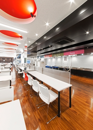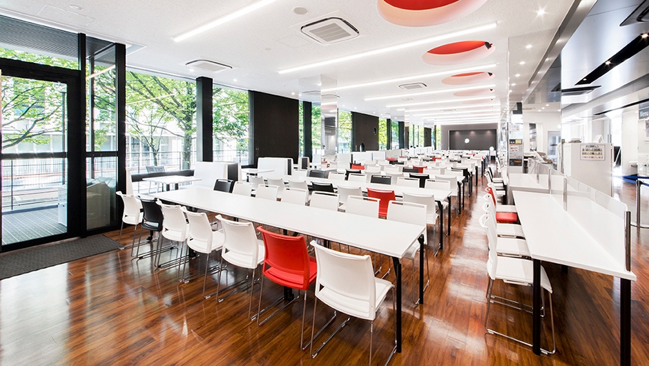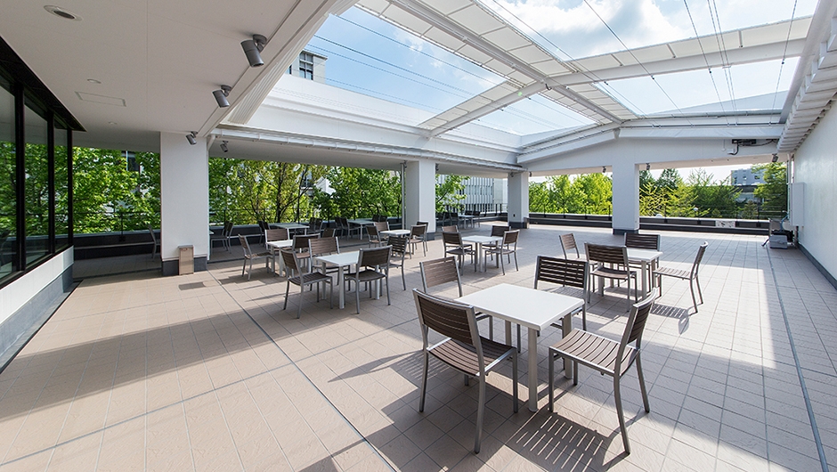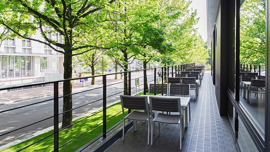 キャンパスの再整備が進められ、2015年に完成した新2号館に続き、新食堂棟となるセントラルテラスが誕生。キャンパス内の別々の場所にあった2つの食堂が、建物の1階と2階にそれぞれ移転し、食堂機能が集約されました。緑豊かなキャンパスの中央に位置しており、食事をするだけでなく、交流の場として学生達に利用されます。2階のテラスは多目的スペースとなっており、バーべキューなどを楽しむことができます。