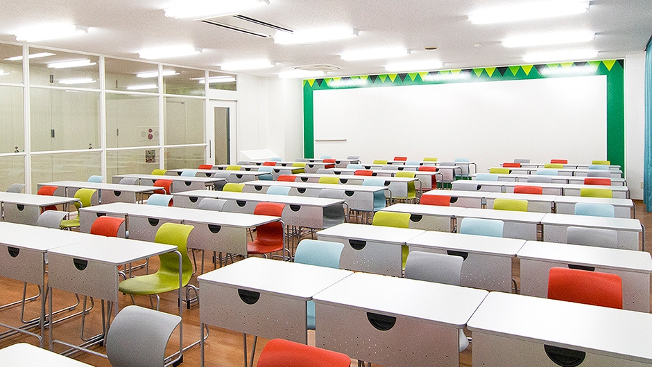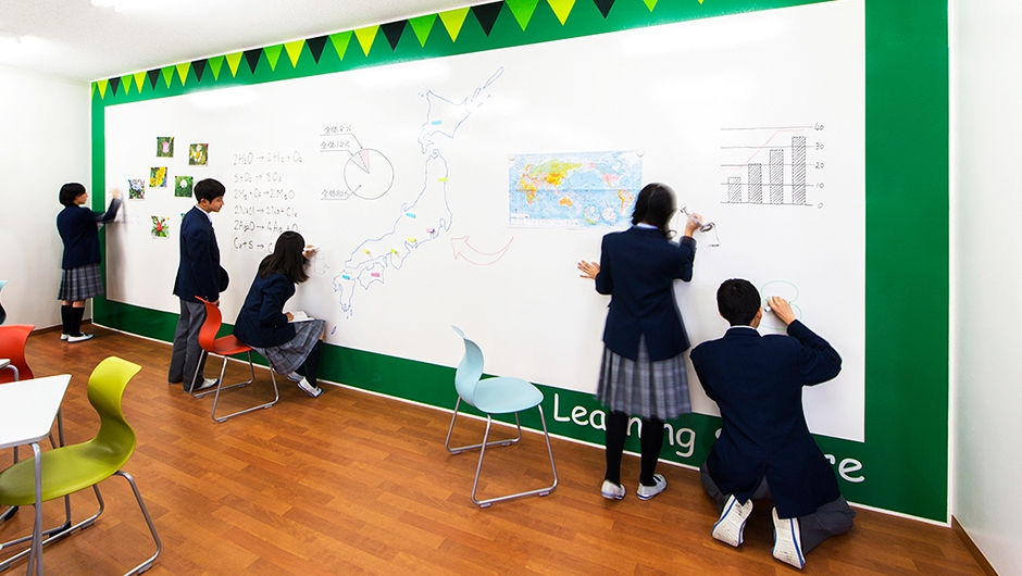 Learning Square(ラーニング・スクエア)は、以前、会議室や倉庫があった場所をICT活用授業やアクティブ・ラーニング形式の授業に対応できる多目的室として改修。廊下側のガラスパーティションからは中の様子が見えるようになっているため、カラフルなイスを設置することで明るく賑やかな雰囲気づくりがなされました。デスクは、軽くて持ち運びが容易な1人用デスクを採用し、様々な授業形態のレイアウトに対応可能。部屋の背面壁は、全面に特殊な塗料を塗布した壁面ホワイトボードとなっており、制限なく広い面を使って生徒が自由な発想で書くことができます。また、壁面ホワイトボードの下地に鋼板を用いているため、マグネットの使用も可能となっています。