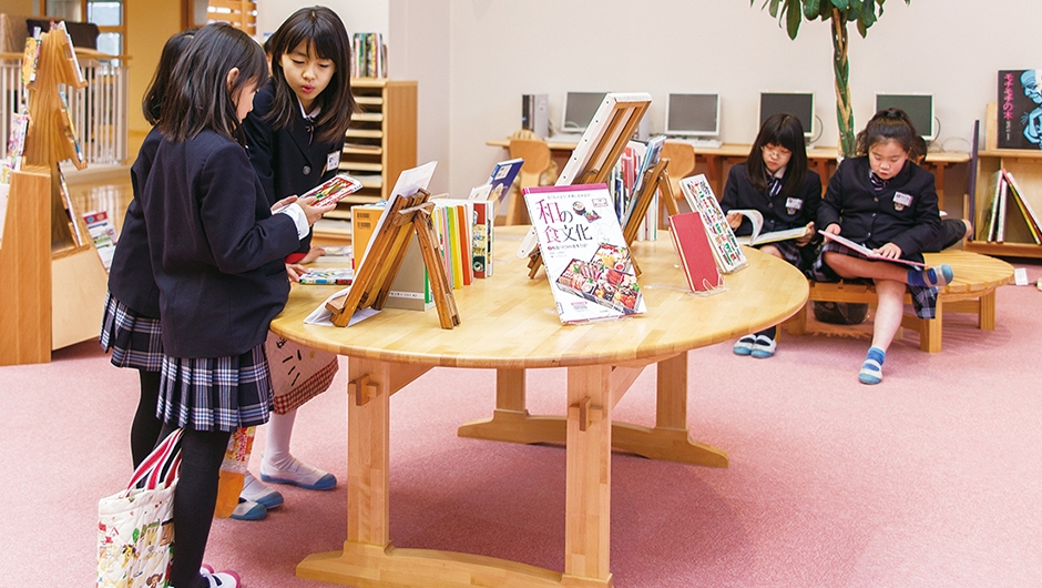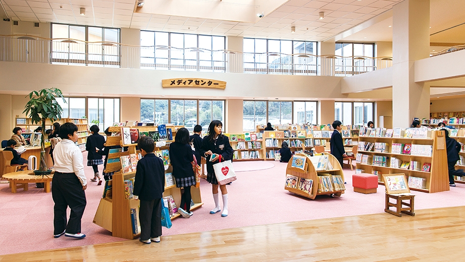玄海みらい学園は、町内の2つの中学校と2つの小学校を統合し、施設一体型の小・中一貫校として2015年4月に開校。玄海町では、学校づくりについて年月をかけて話し合いが行われ、子どもたちが9年間を通して学年を越えて学び合い、新たなことに挑戦できる教育環境が整えられました。なかでも、学校の中心に位置するメディアセンターは、その教育にとって重要な役割を持ちます。
