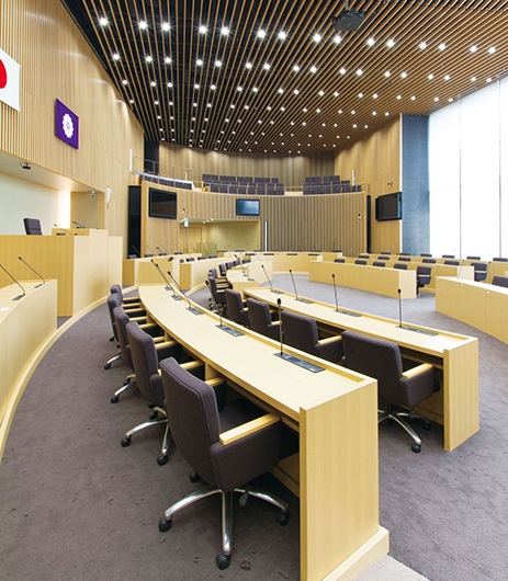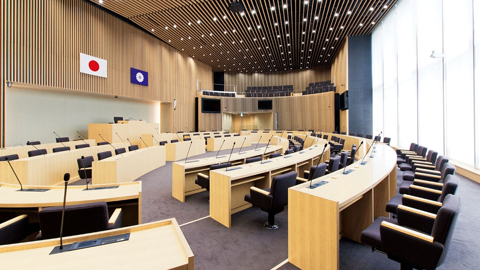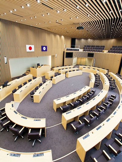 議場/議場椅子:特注品、議場机:特注品、傍聴席:ATS-1108DR特注品、ATS-1108DR-TA/APS特注品 計94席