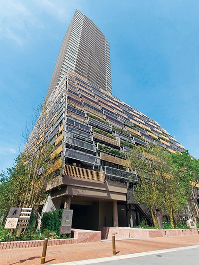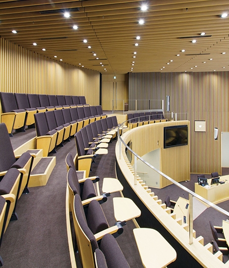 区役所の上層部はマンションが入っており、民間施設を併設した庁舎は、全国初。8、9階にある議場は、楕円形に配置され、参加者の一体感と求心性が高められました。また、一部の座席を移動式としているため、議会モードと会議モードの2パターンレイアウトが可能。区議会が開催されない時は、区民が参加するイベントや会議などに使用されます。
