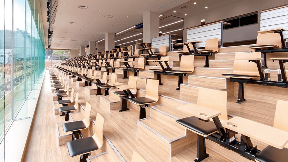 1階一般観覧席には、ドリンクホルダー付タブレットを装備。タブレットは、通路からアクセスしやすいよう、2人掛け座席のセンターより左右に分かれる形で備え付けられています。