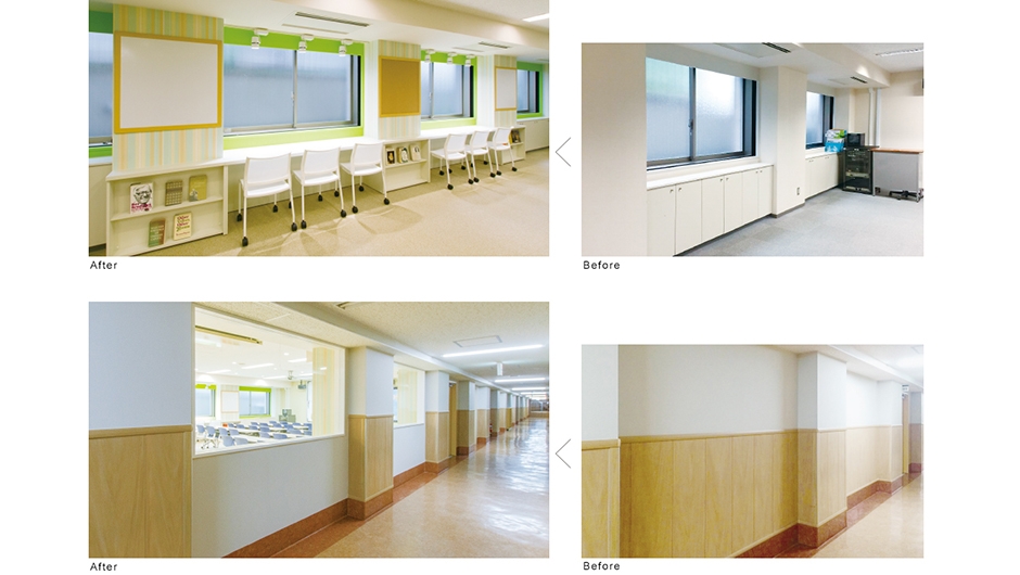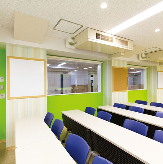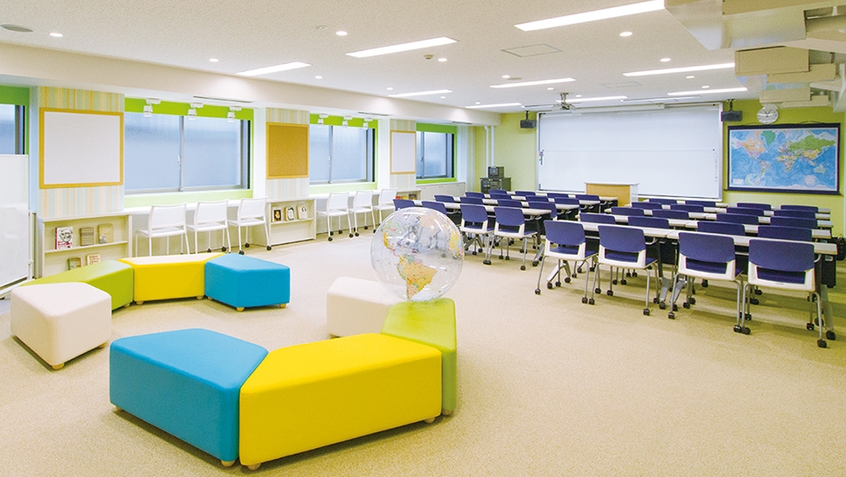 以前、視聴覚教室であった場所を、生徒が外国語を実践的に学ぶ「ランゲージスクエア」へ改修。2020年より実施される「読む」「書く」「聞く」「話す」の4技能を測る大学入試に対応するため、放課後はネイティブの教員を常駐させ、生徒の英語コミュニケーション能力の向上を図ります。廊下側の壁は、中の様子が見えるように腰より上部をガラス張りに施工して、開かれたスペースへと変化させました。さらに、内装をカラフルにすることで明るく賑やかな雰囲気を演出し、生徒が楽しくアクティブに学習できるように促しています。