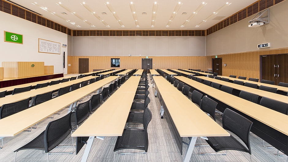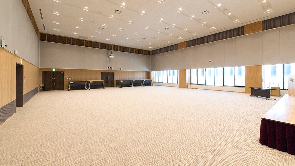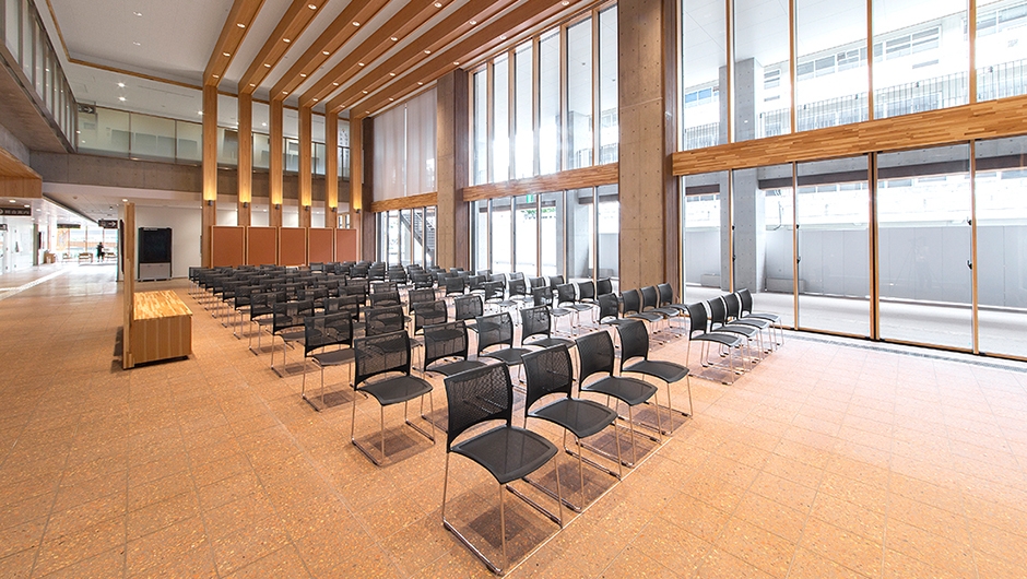 1階市民ホールは、扉を開放すると屋外の「市民の広場」と一体利用でき、様々なイベントに活用されます。5階の議会会議室や委員会室に設置されたテーブルは、いずれも天板や幕板にナラ材を採用し、重厚感を演出するとともに、全体の統一感や汎用性を高めています。