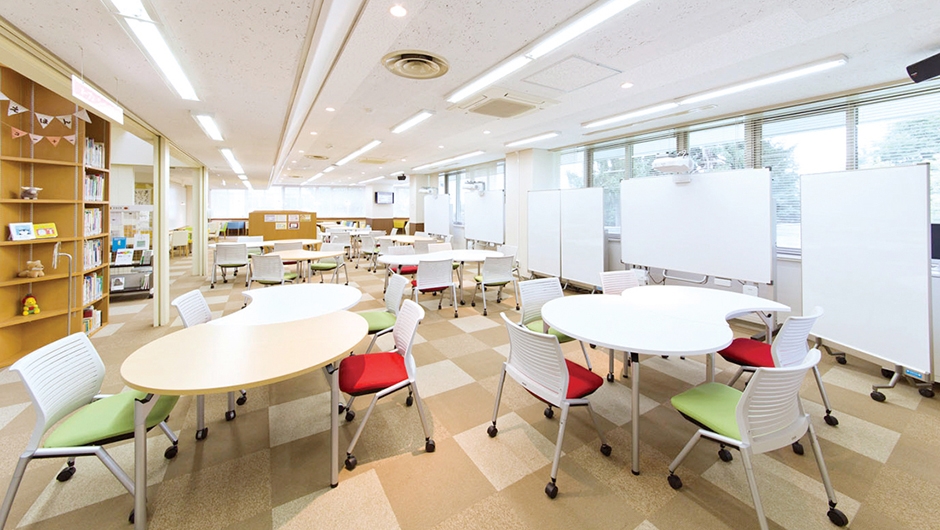 ICT機器や図書館資料などを利用したアクティブ・ラーニングを促し、ゼミ活動や授業にも対応できるフレキシブルな空間を創設するため、図書館のリニューアルが実施されました。図書館2階は、オープンワークスペースやグループ学習室などラーニング・コモンズエリアとして整備され、グループワークやプレゼンテーションなど図書館内でも会話が可能な学習スペースとなっています。3階は、個人学習スペースなどが用意され、個人が落ち着いて利用できる空間としています。
