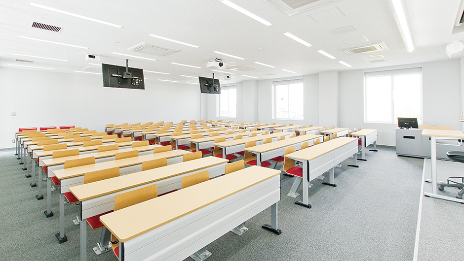 講義室〈1〉/講義デスク・イス:SCF-5105、可動イス:ティーポ、教卓:S-30特注品、教卓用イス:RC-600 固定席118席・可動席3席 総席数121席