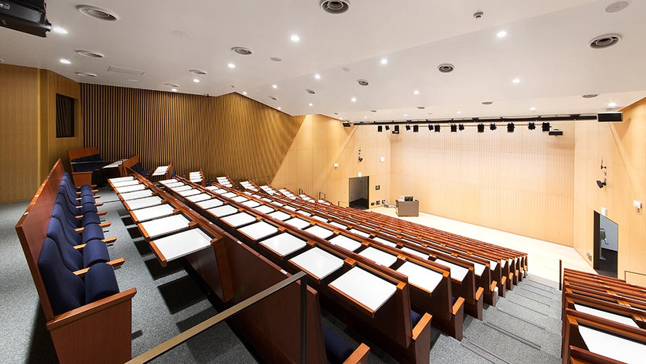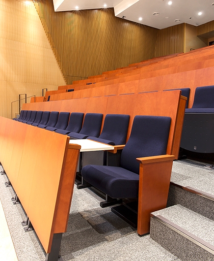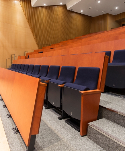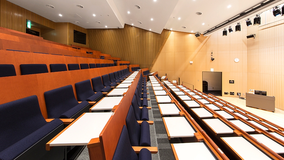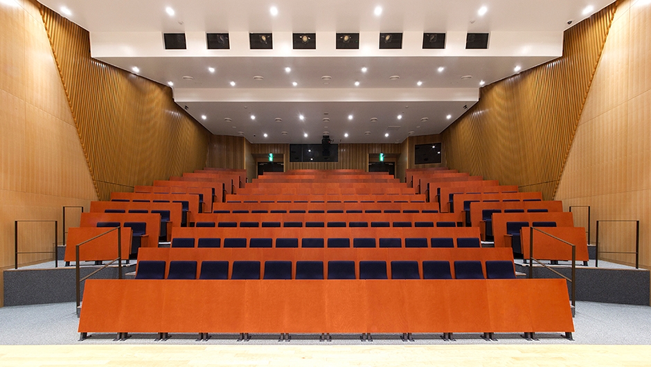 ホールは、客席194席を有し、貸出施設として利用される予定です。各席にはA3サイズの大型タブレットが備えられているため筆記を伴う聴講に対応できます。また、1人当たりの座席幅は550mmとゆとりを持った仕様となっています。