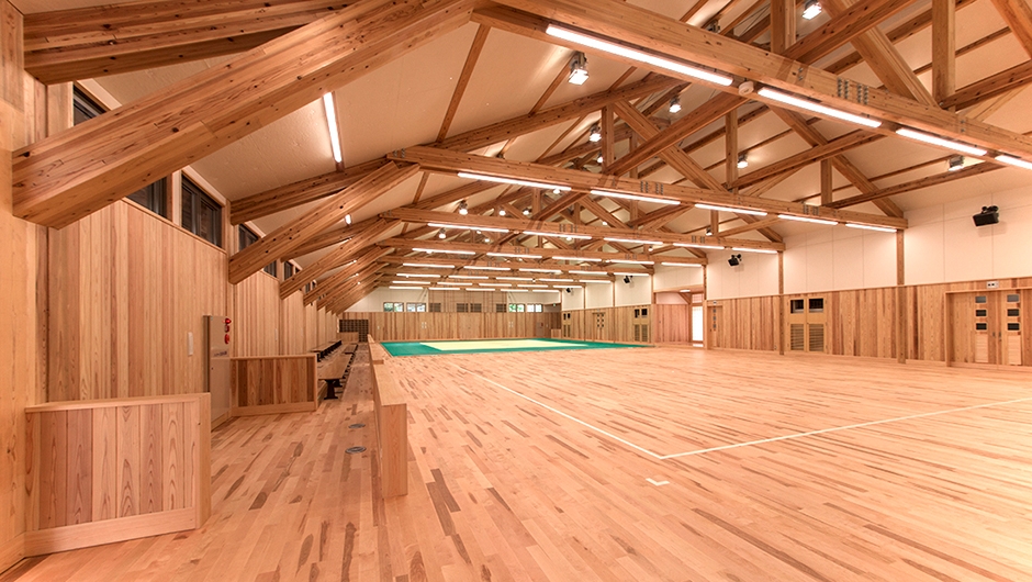レクリエーションやスポーツを中心とした総合公園内に新設された武道場。施設には県産のスギ材やヒノキ材を使用している他、玄関やトイレなどには、地元の砥部焼のタイルを施しています。2017年の愛媛国体では、同公園がバドミントン競技の会場となっており、武道場も控室としての使用が予定されています。