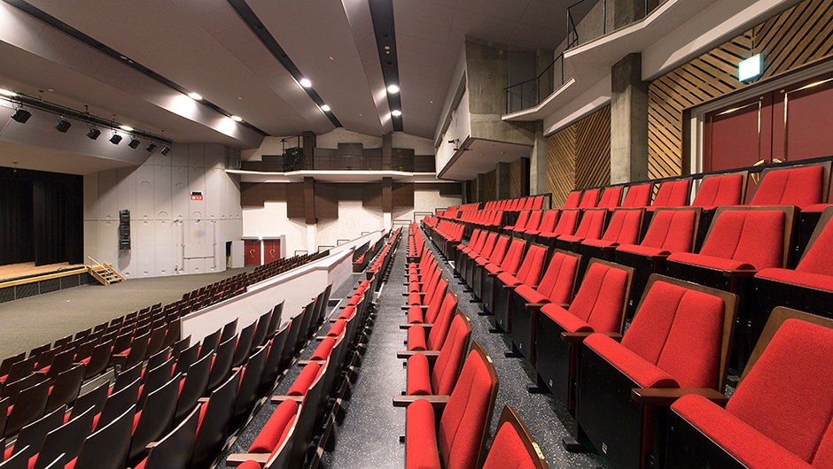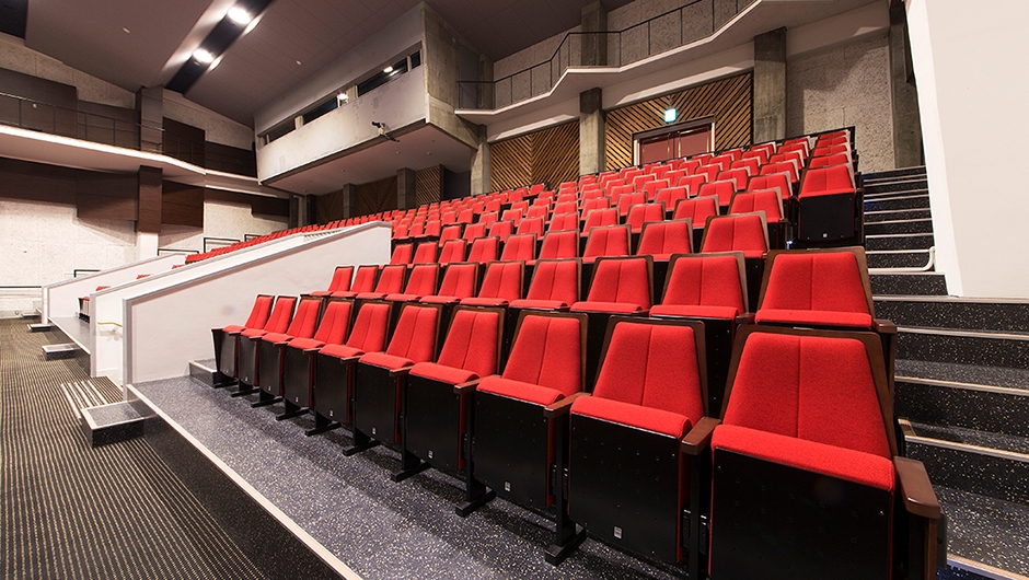 ホールは、多目的利用に対応可能な平場部分の平土間式はそのままに、内装と客席のリニューアルが行われました。客席は、ゆったりとした座り心地を確保するために、改修前より席数を減らして1人当りの座席幅を450mmから490mmへ拡大。さらに肘の形状を奥から手前に向かって細くすることにより、ゆとりをもって着座へアプローチできるよう工夫されています。