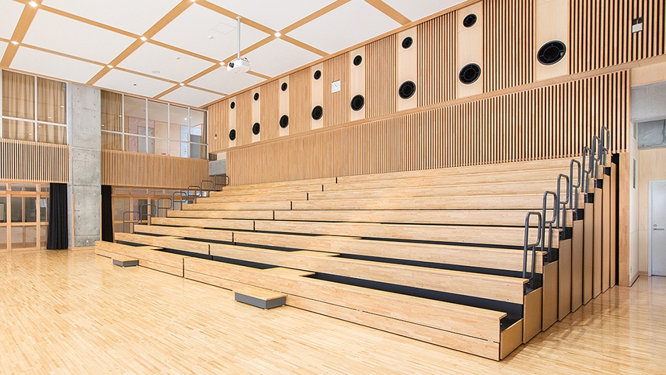 1階多目的ホールに設置された移動観覧席は、手動式で集会やイベントなどに合わせて設置・収納が可能。隣接する東中学校の生徒も利用することがあり、小中連携を図っています。