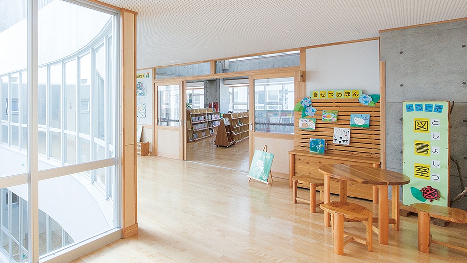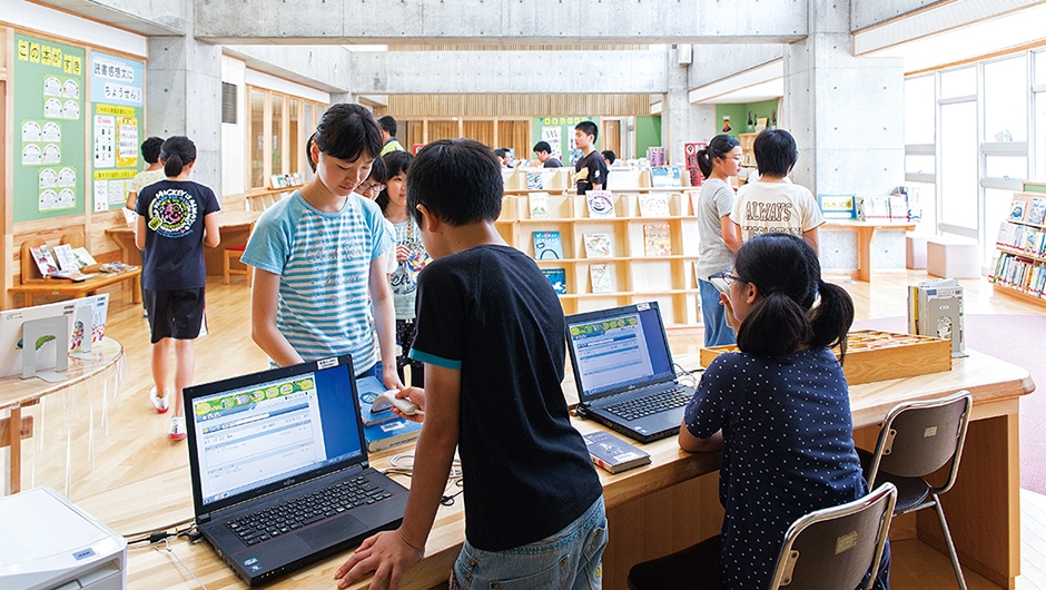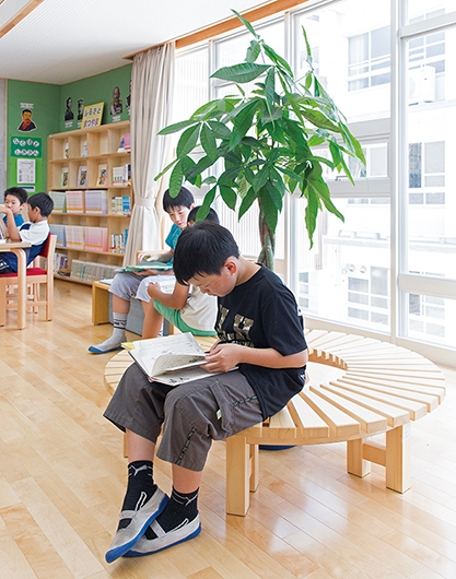 東雲小学校は、改修が行われた東中学校と新設された教育研修センターとの間に位置し、両施設から渡り廊下で接続できます。新校舎は4階建てで、メディアセンター(図書室)は、どの教室からもアクセスしやすいよう2階の中央部に配置。また、メディアセンター(図書室)から直接PC教室へ入ることができ、調べ学習などで相互に活用されます。