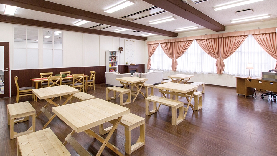 コミュニケーションラボ・リラックスルーム/ダイニングテーブル・イス(奥)、ソファ、テーブル、電気暖炉、デスク、回転イス、本棚、プロジェクター、ホワイトボード、カーテン、内装工事(床・天井・壁面)