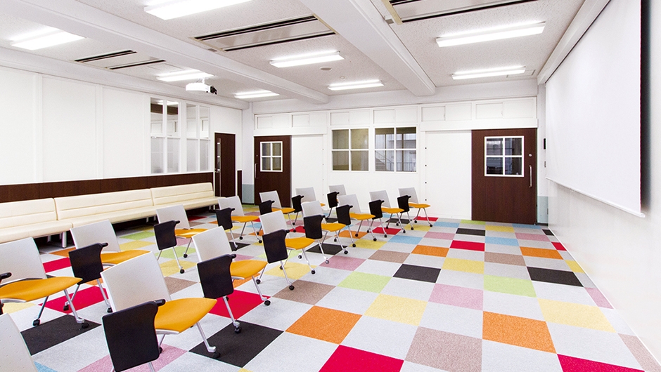 コミュニケーションラボ・アクティブルーム/タブレット付イス:デューン、プロジェクター、スクリーン、ホワイトボード塗装、内装工事(床・壁面)