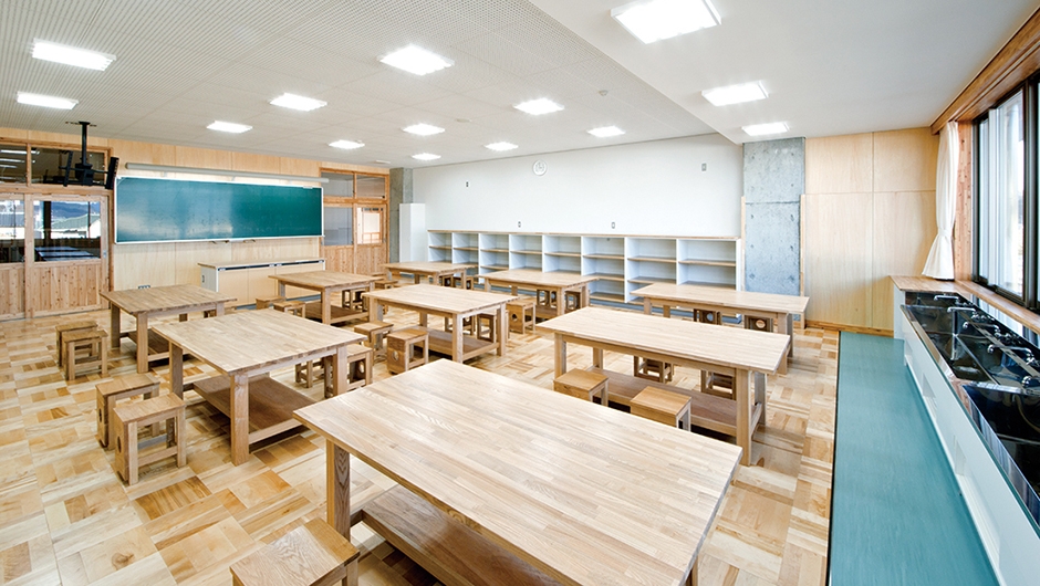 佐久穂町は、町内の4小学校・2中学校を統合。施設一体型の新しい校舎が建設され、2015年に開校しました。新校舎は、佐久穂町産のカラマツを教室や廊下、教室との間仕切りなどに使っているため、木の風合いが温かみのある空間となっています。