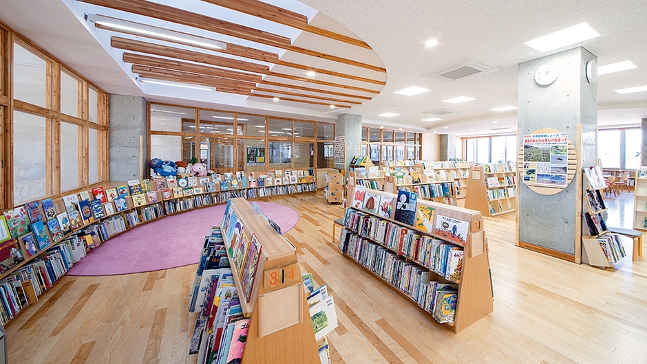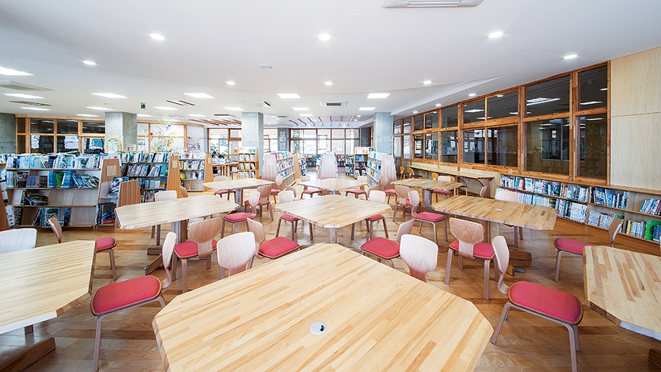 小・中連携教育を軸とした空間計画がなされ、全生徒が共用する施設のひとつである図書館は、異学年の交流を促す重要な役割を持ちます。図書館のレイアウトプランや家具は、「平湯モデル」が導入されました。