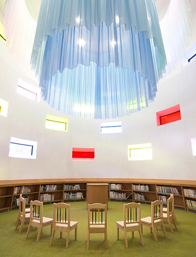 2015年10月、こどもプラザ・男女共同参画センター・図書館・コミュニティセンターの機能を併せ持った複合施設として開館しました。人づくり・人のつながりづくりを目指し、地域コミュニティ再生につなげるための新たな交流の場を設けています。各空間に配置したテーブルの多くはキャスター付なので、レイアウト変更が容易に行え、多様な交流スタイルに対応できます。多目的ホールの壁面には、西脇市の地場産業である播州織(ばんしゅうおり)のタペストリーがあしらわれています。