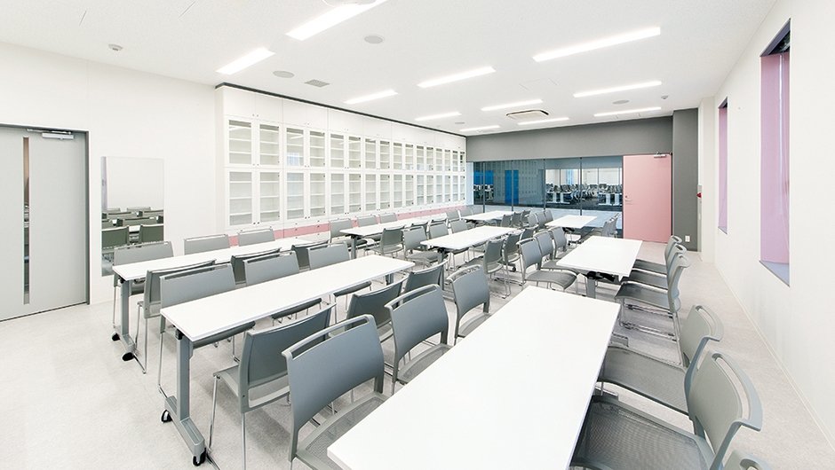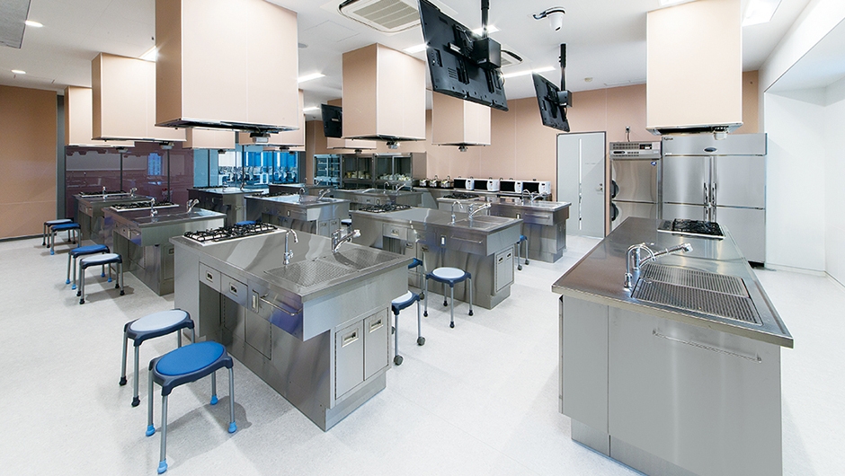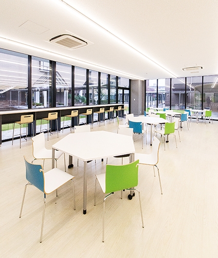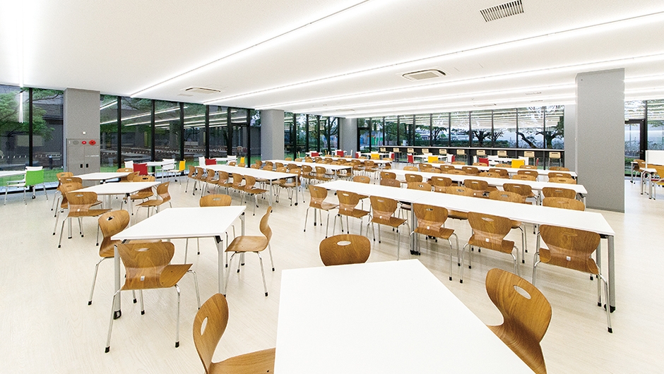 2016年に迎える創立60周年に合わせ、キャンパスの新たなシンボルとして「FLOS(フロース)館」が建設されました。FLOSはラテン語で花を意味し、今後も学園が花開き発展していくようにという願いが込められています。館内には、健康栄養学科が実践の場として活用していく学生食堂やフードビジネス学科の実習室、情報メディア学科のメディアラボや撮影スタジオなどが配置され、全学科の学生が利用する施設となっています。