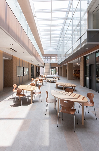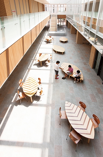 ガレリアには、同校が所在する愛知県稲沢市が日本4大植木生産地であることをモチーフにした葉っぱ型のテーブルやベンチを設置。葉脈はタモとウォールナットの二種の木材をつなぎ合わせて表現しています。天窓から光が降り注ぐ明るく開放的な空間で学生や教員の憩いの場となっています。