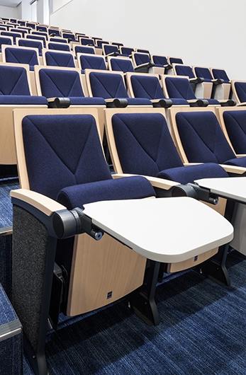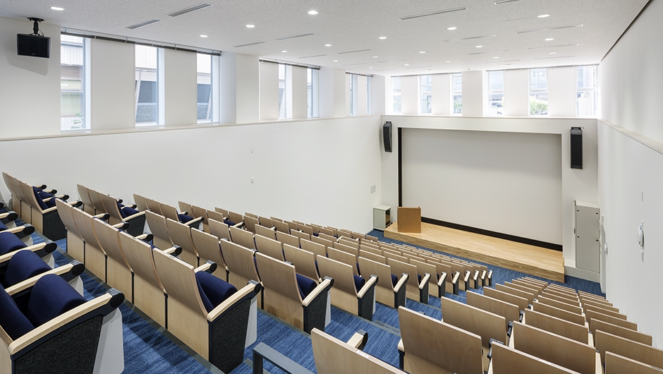 2015年に新築された、材料科学分野の新たな研究拠点施設です。 1階レクチャーホールは129名を収容し、国内外の研究者の交流や会議などに利用されます。ステージから見て左側3列は、座席幅を560mmに拡張して体格の良い外国人でもゆったりと利用できるよう配慮されています。(その他の座席幅は520mm)また、客席には収納式の大型タブレットを装備しているため、会議時にPCを置いたり筆記をすることが可能です。