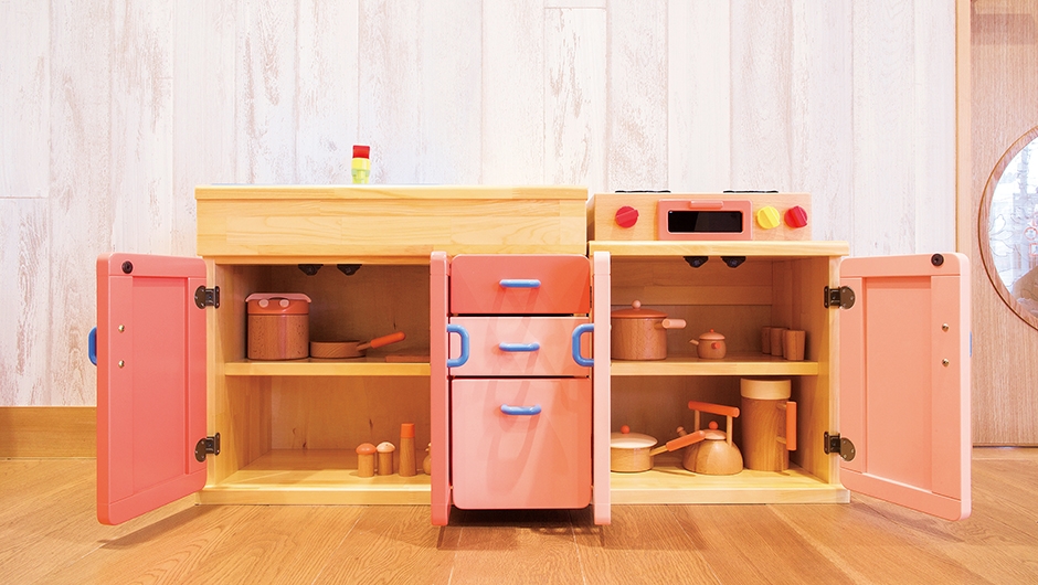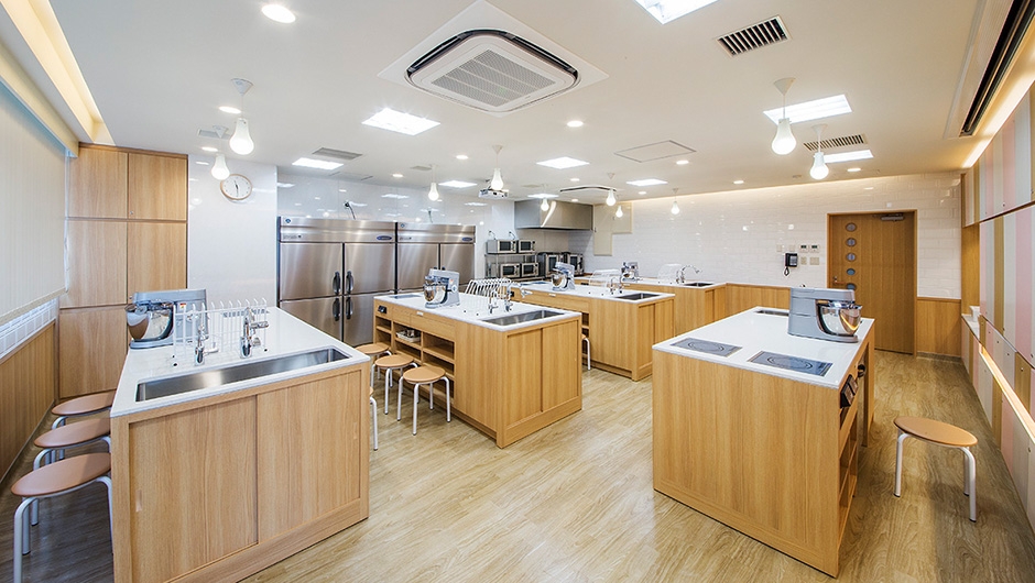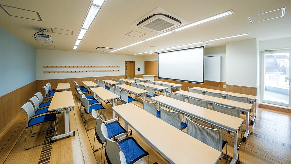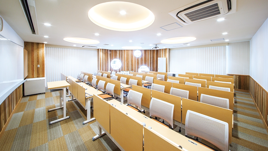 2015年4月、校舎移転に伴い新校舎が建設されました。木のぬくもりが感じられるイス・テーブル、パステルカラーを配したベンチマットや玩具にいたるまで、こどもの保育と教育の人材育成にふさわしい明るい空間づくりをしています。1階エントランスには、収納性が高いタブレット付イスを採用。オープンキャンパスなどの催しの際は、筆記のできるイスとして配置し、使用しない時はコンパクトに収納できるため、空間の多目的利用が可能となっています。