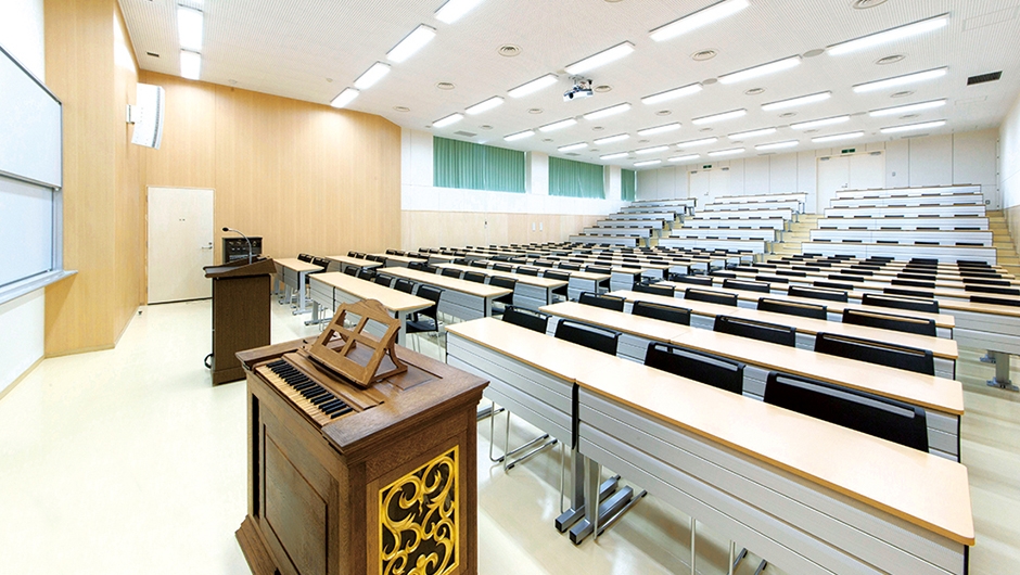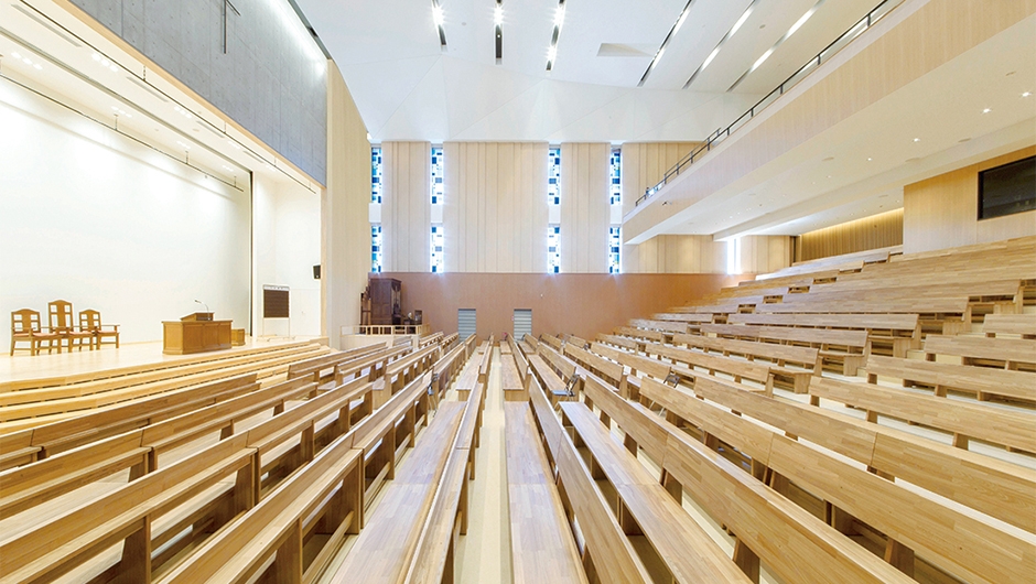 2011年に迎えた創立120周年を記念して中学校・高等学校の建て替えが計画され、2015年に校舎棟、2016年に体育館棟が完成しました。校舎棟の中央には、キリスト教教育の拠点となる礼拝堂が配置され、毎朝礼拝を行う全校生徒を収容できる座席数を確保。礼拝堂という神聖で凛とした空間でありながら、ナチュラルカラーの木製ベンチがぬくもりのある雰囲気を演出し、生徒や教員を穏やかに迎え入れます。