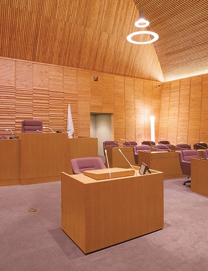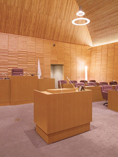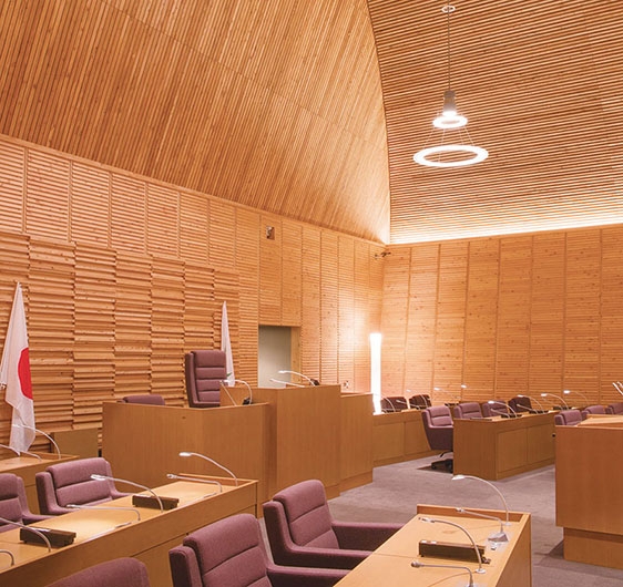安曇野市は、2005年に合併以来、市内9箇所に分散していた本庁機能の集約を図るため、2015年に新庁舎を建設し、同年5月に開庁しました。庁舎の外装パネルには、市有林を間伐したヒノキ、内装には県内産のカラマツといった木材をふんだんに使用しており、温もりのある建物となっています。議場家具の一部は、旧掘金村庁舎の議場で使用されていたものを補修して移設。質実剛健を目指した新庁舎のコンセプトが体現されています。