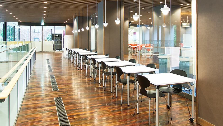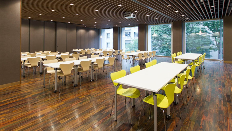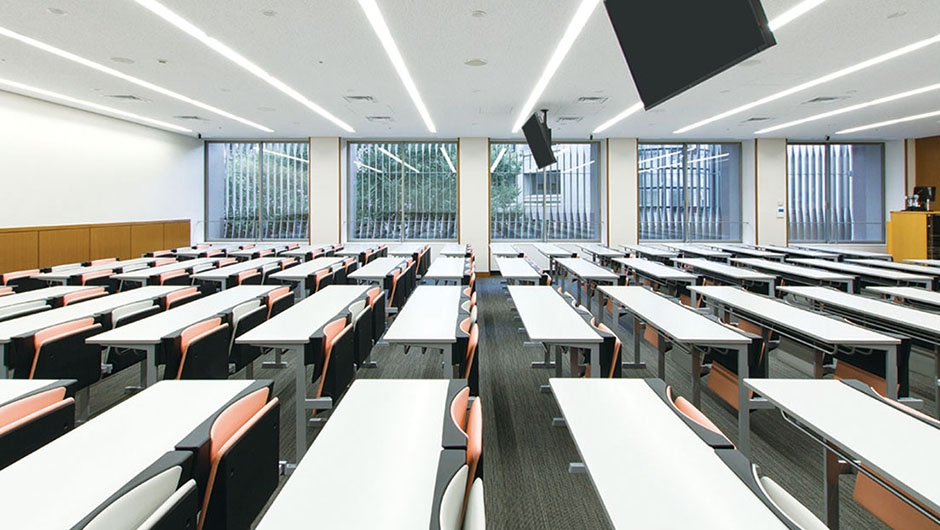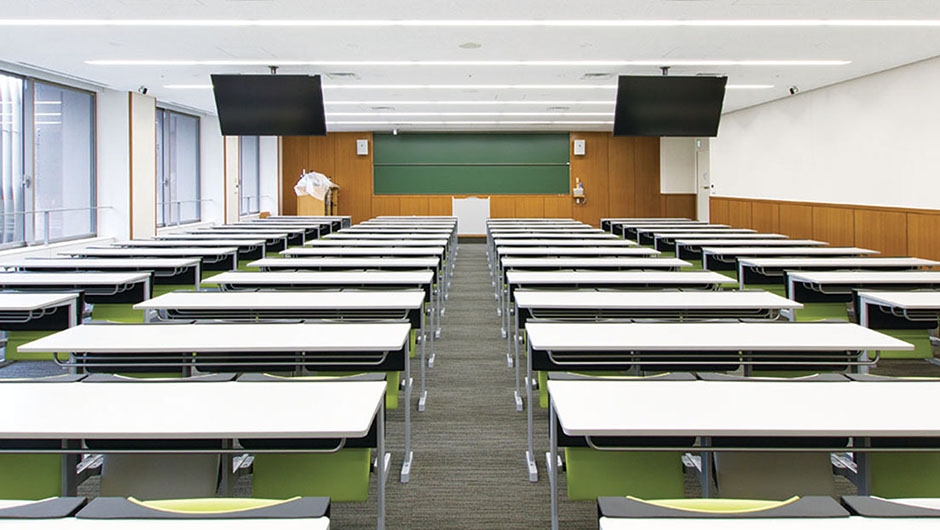 キャンパスの再編を図ることを目的に、千代田キャンパス再開発プロジェクトが進められ、本館E棟・F棟が建設されました。3・4階の講義室に設置された講義イスは、パステルカラーの張地を採用し、女子大学らしい明るく華やかな雰囲気づくりがなされています。また、張地の色を互い違いに変えることで、試験時などでは速やかな指示、誘導に役立ちます。