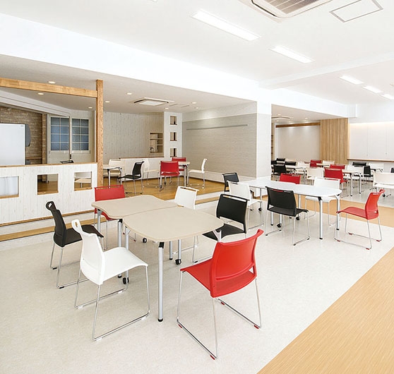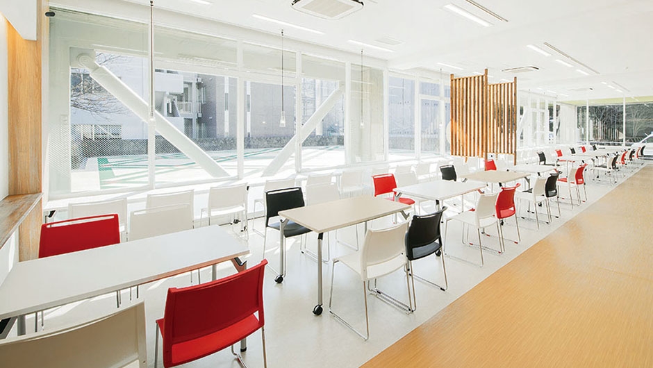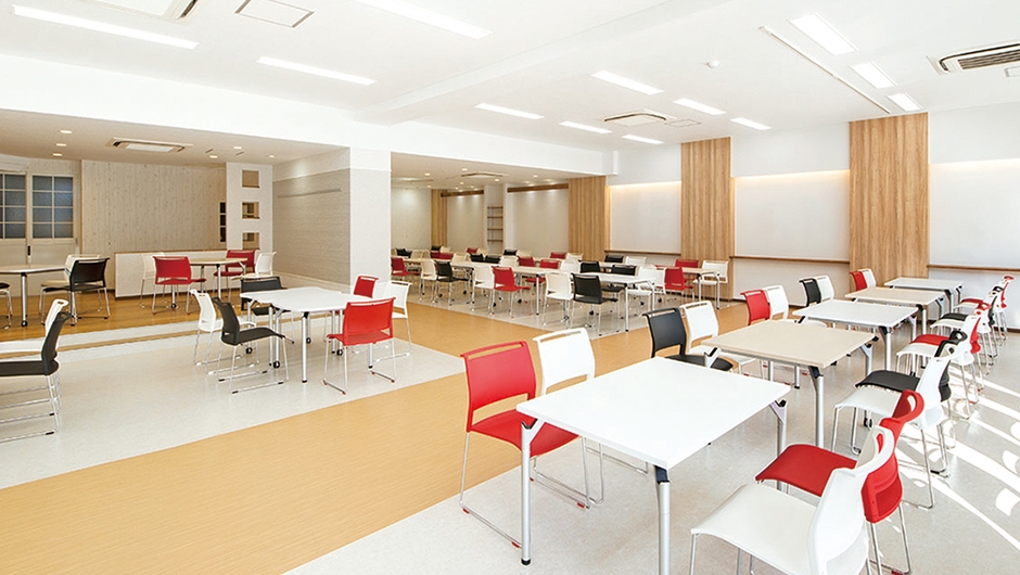 建物の耐震工事に伴い、学生食堂「和(なごみ)」のリニューアルがなされました。白と木目を基調とした内装に、赤・白・黒の色鮮やかなイスを配置し、明るく賑やかな雰囲気を演出。通常の食堂利用の他に、学生ホールとして開放されています。