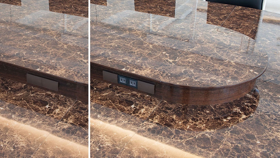カスタマーセンターを設けるため、新たに社屋が建設されました。大会議室のテーブル天板は、部屋内にある大理石貼の柱と意匠を合わせ、高級感のあるデザインとなっています。また、テーブル中央部分には、スライドカバー式のACコンセントを装備し、PC利用などに対応しています。