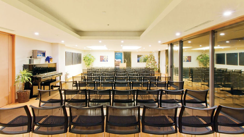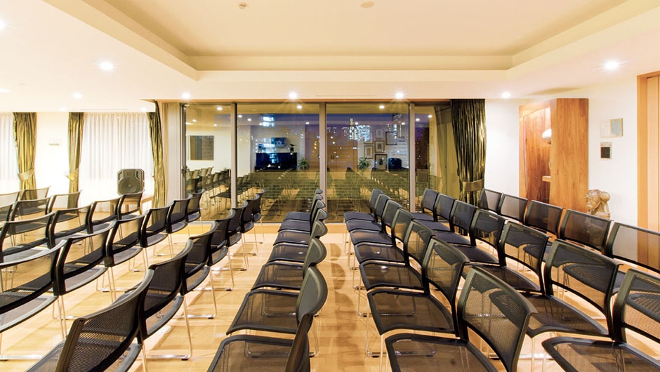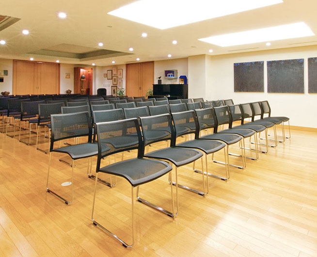 セミナーやパーティーなどの会場として利用されるレセプションルームでは、以前より木製椅子を使用していたが、レイアウトの変更に労力がかかっていたため、軽量でスタッキングが可能なイスが採用されました。新たに採用されたメッシュスタッキングチェアは、レイアウト変更が容易な他に、海外からの利用者に対しても充分なサイズと必要な強度を満たしています。