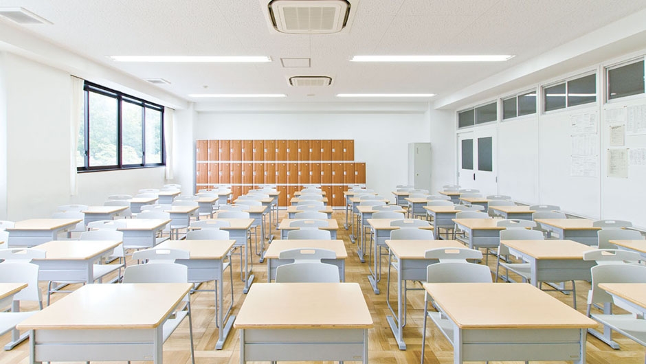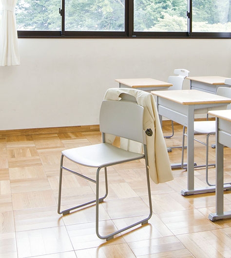 創立100周年を迎えるにあたり、既存の校舎の跡地に新教室棟と体育館を建設。教室の生徒用イスは、ブレザーなどを掛けることができるハンガー付タイプです。ハンガー部分は背もたれからセットバックしているため洋服を型崩れさせないつくりとなっています。