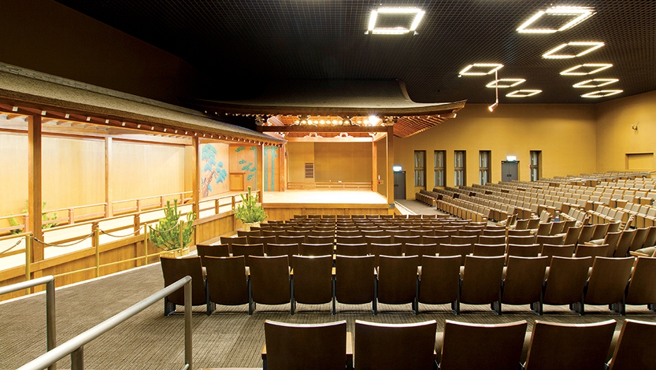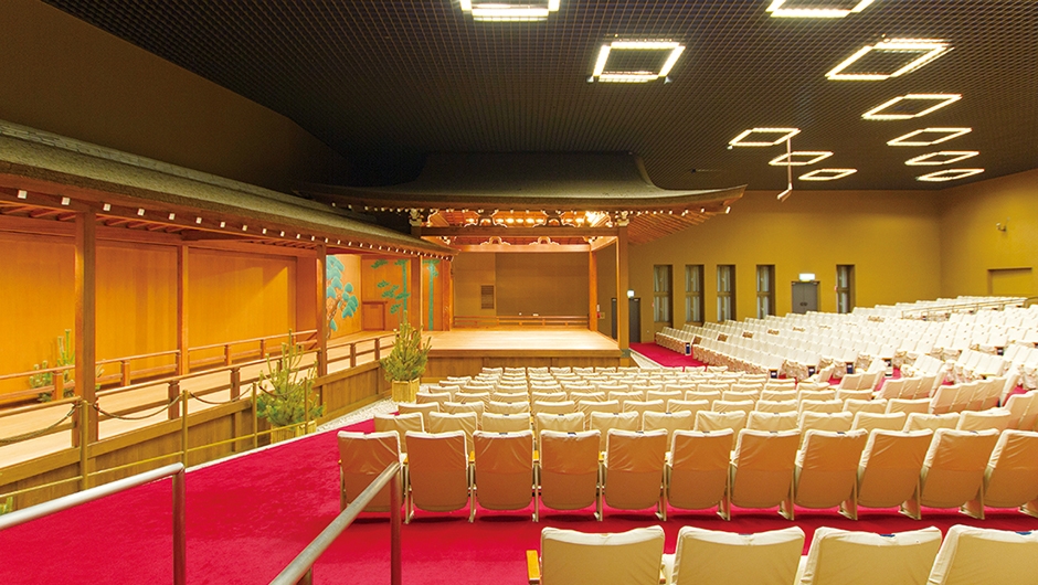 宝生流は、室町時代より続く能のシテ方(※主役を演ずる役者。現在は、シテ方の流派として宝生、観世、金春、金剛、喜多の5流派がある。)の流派です。 拠点の宝生能楽堂は、創建から幾多の変遷を経て、1978年に現在の姿が完成しました。 昨年の35周年を機に、観客へのホスピタリティーを向上するために観客席の全面改修を行ないました。元来は屋外で催されていた能楽(※能と狂言の総称)。その舞台を囲んでいた自然の色調 “アースカラー”をテーマに、劇場環境をリニューアル。