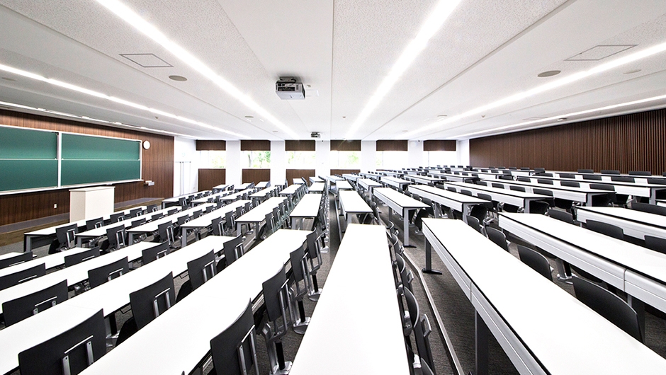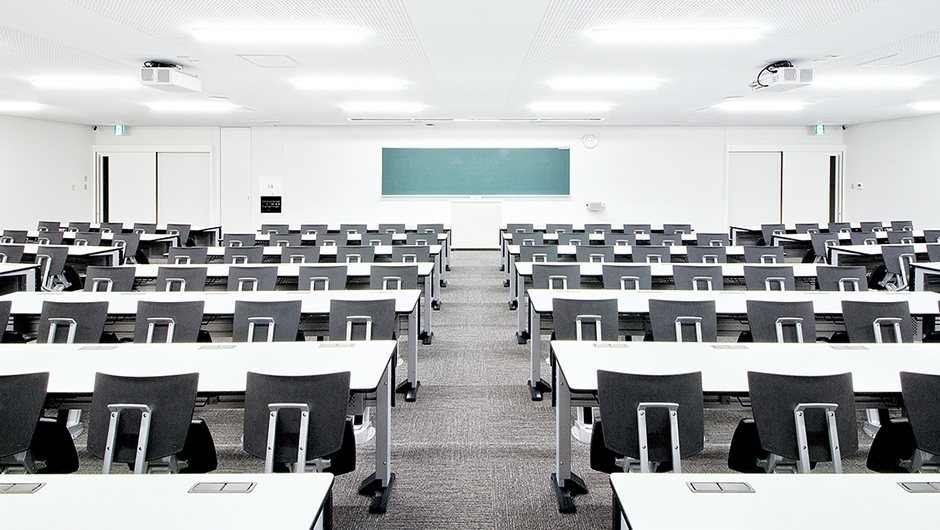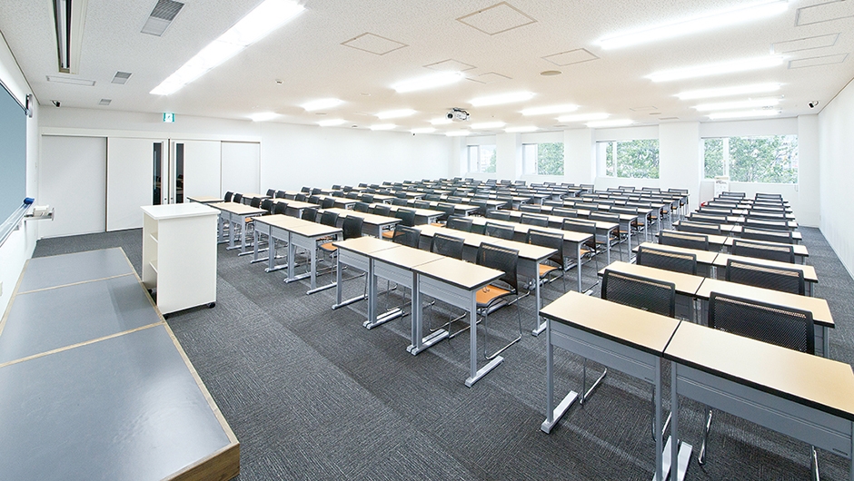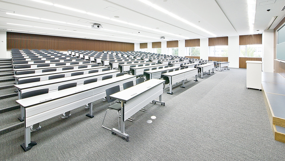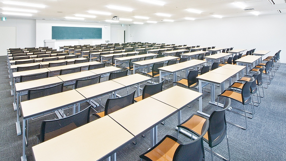 1階 A106講義室/講義デスク・イス:SCF-5505-7、移動イス:SCM-5505、移動机:CTN4特注品 固定席250席・移動席6席
