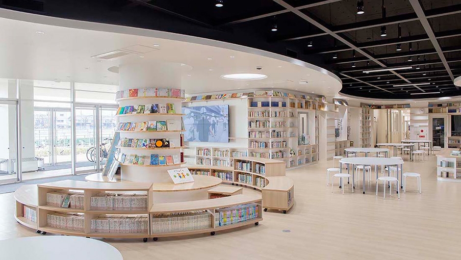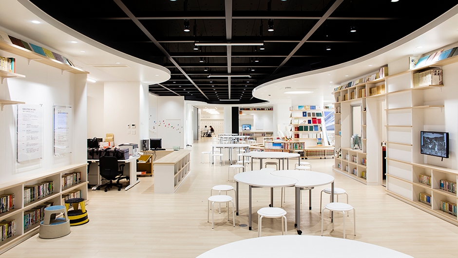 3階 Port S/丸イス、テーブル:DT-15特注品、書架:特注品