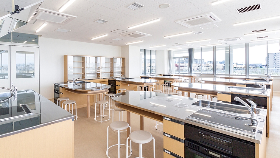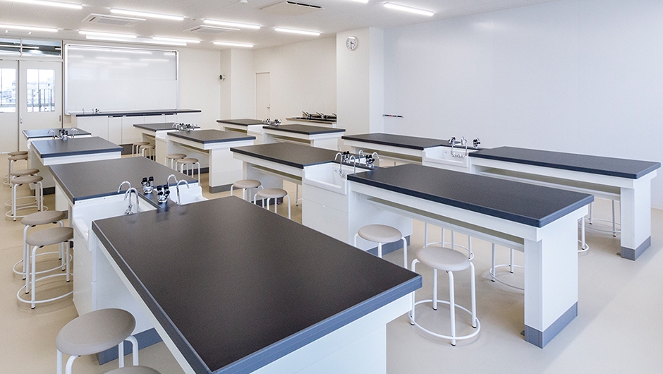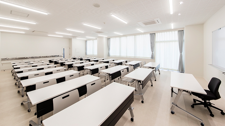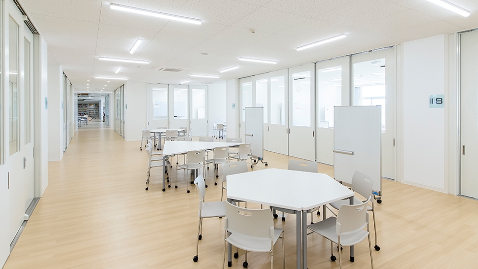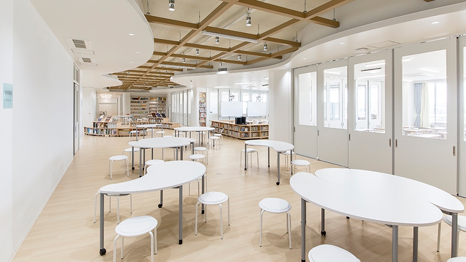 新校舎では、校舎内全てを学びの場と位置付け、いつでもどこでも学びが展開できるよう一つの空間を自在に間仕切りできるようにし、机・イスなどの家具も全て可動式にしています。これにより、扉を開放すれば複数クラスが合同で学べる一体的な空間となり、扉を閉じればグループ学習や個別学習にも対応。学びの形態が多様にアレンジできることで、生徒主体の「学びあい・教えあい」が促進されることが期待されています。