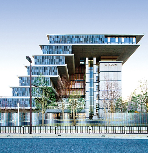金融大学校は、多様な金融専門家を養成するために2010年に設立された企業内学校で、入行と同時に入学し、退職まで研修を続けます。これまでは、2つの研修施設で役職員の人材育成を行ってきたが、研修の場が分散しているうえに収容人数や設備に課題が生じてきたので、2014年、創立70周年記念事業の一環として、JR桂川駅前に桂川キャンパスが新設されました。この施設は、次の75周年に向けた第5次中期経営計画「ビジョン75~いい銀行づくり~」の人材戦略において、中心的な役割を担います。