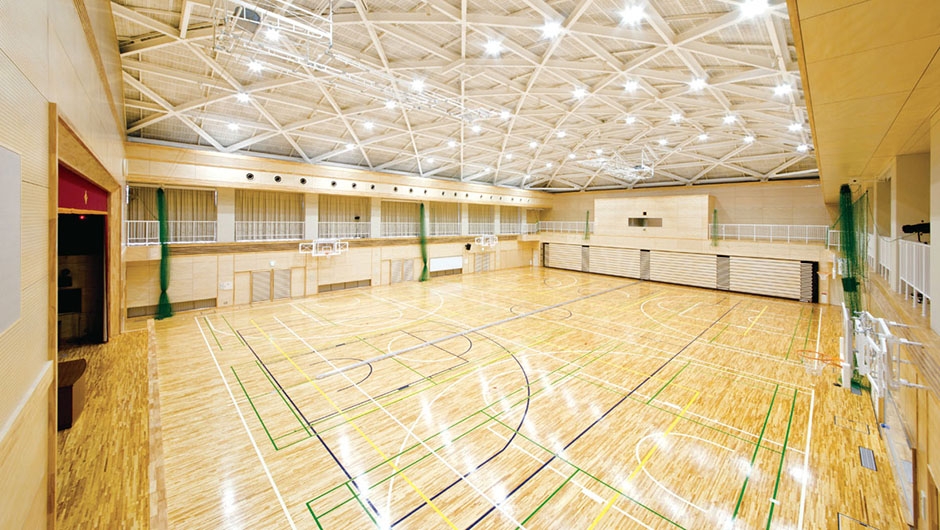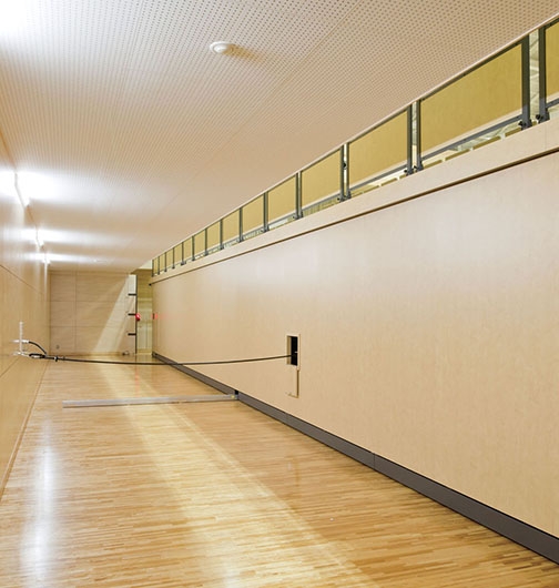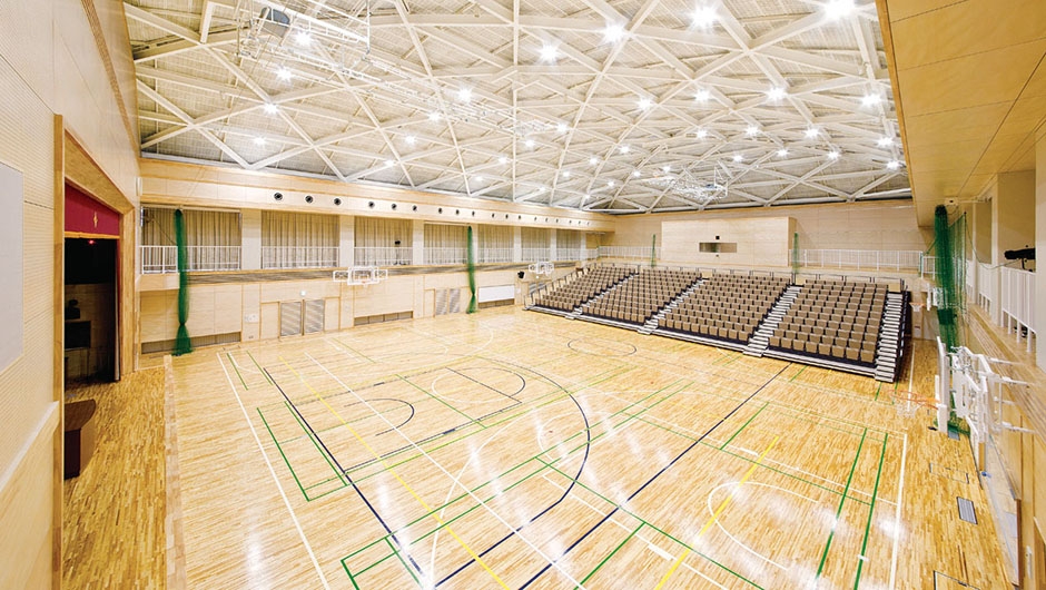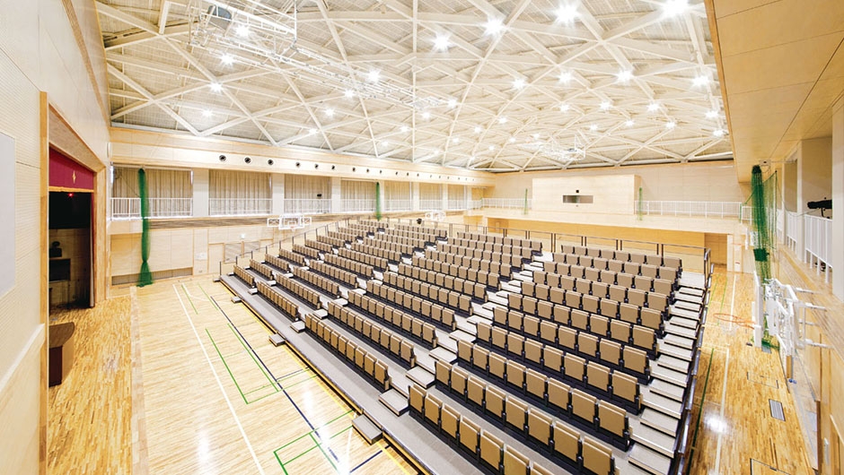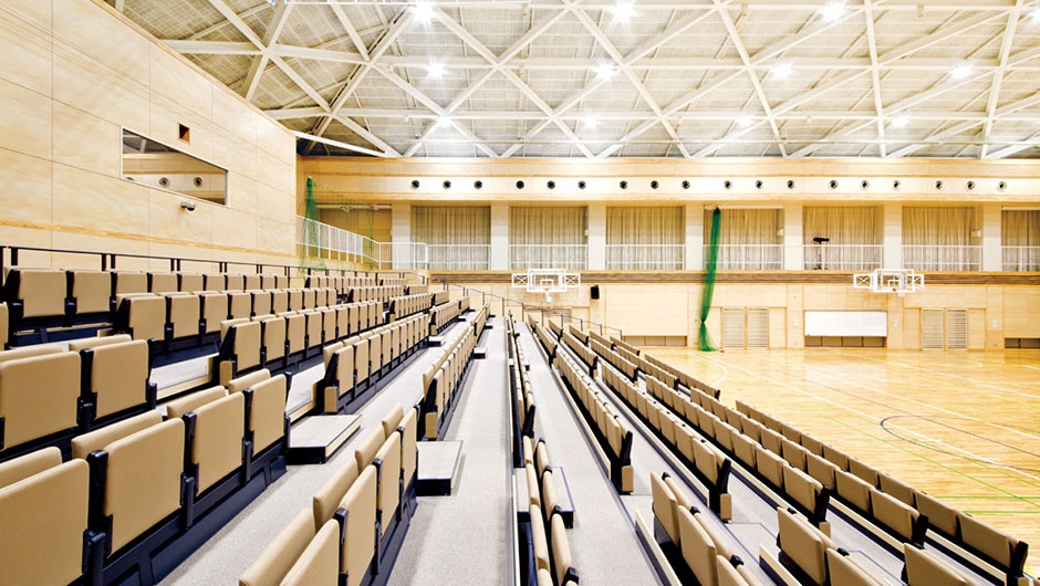 アリーナでは利用形態に合わせて任意の場所まで移動ができる観覧席が採用されました。 移動観覧席は収納庫から展開した後、前方に移動するレール設置タイプです。展開状態で移動させることにより、床への負荷を最小限に抑えられています。観覧席最上段には横通路があり手動起立式の手すりを設けています。