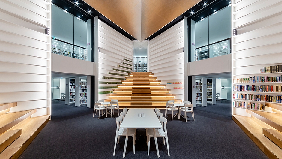 3・4階から宙づりのように見える図書館「アラムナイライブラリー」には、10万冊の図書と360席の閲覧室、8室のグループ学習室が設置され、学内移動にはここを頻繁に通るように設計されており、中心の3つの台形状の大階段はプレゼンテーションにも活用できます。また、2階から4階の廊下にも図書を配架し、カウンターを設置して自習コーナーにするなど、図書館を中心に学びの空間を創出しています。