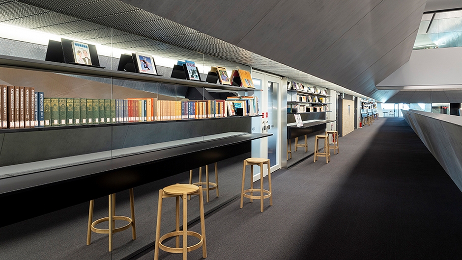 2階 ディスカバリープロムナード/書架:造作家具(背面鏡工事)