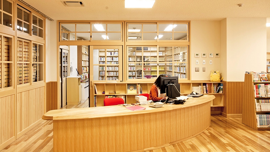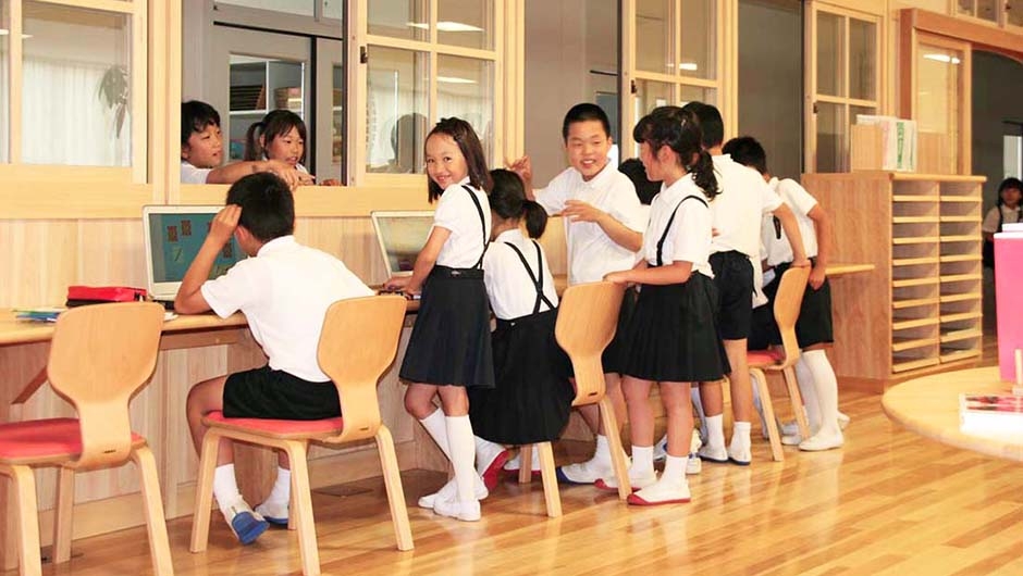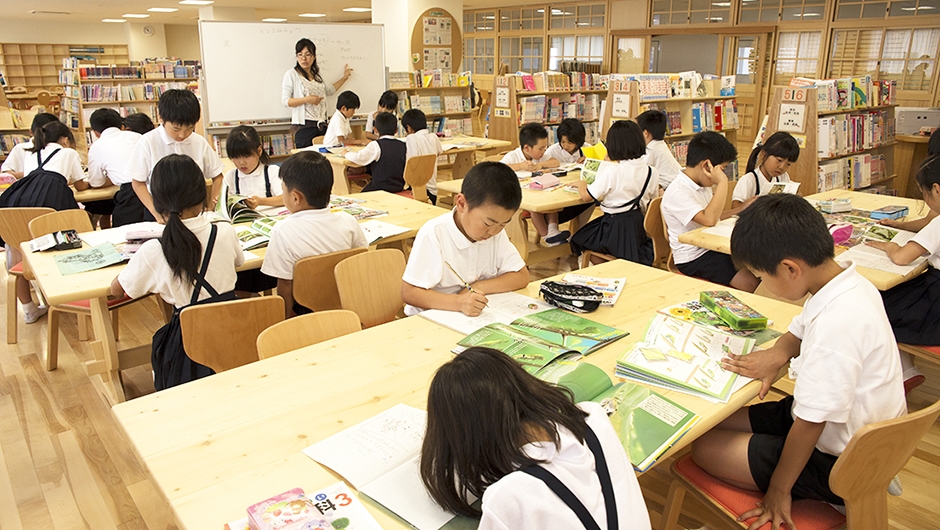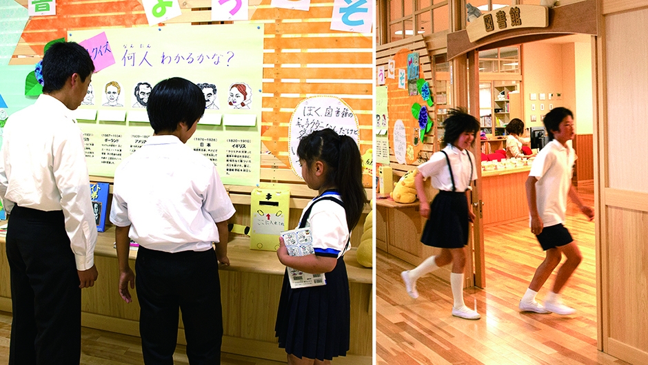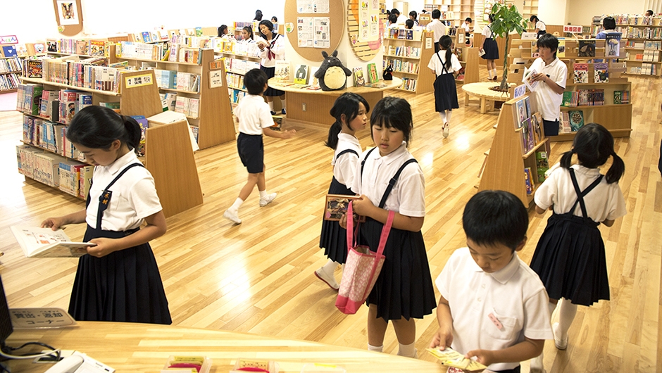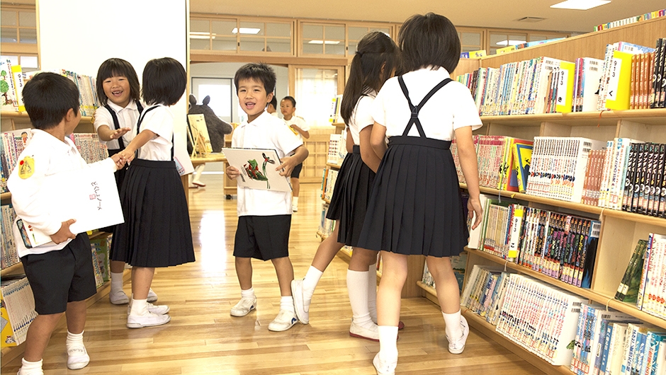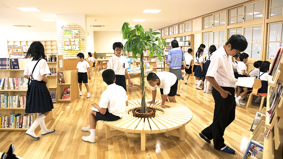 2013年4月に開校した大内小学校は、東かがわ市の大川中学校区学校再編事業として、2つの小学校を統合し大川中学校内に併設・新築されました。市が目指す小・中連携教育を軸とした学校づくりを進めるうえで、小・中学生が共用する施設は、双方の教育および生活面をつなぐ重要な役割を持っています。新図書館もそのひとつであり、共用に必要とされるスペース・機能・構成や活用について十分な検討がなされ、小学生から中学生まで幅広い年代の利用をサポートする専任の図書館支援員が配置されました。