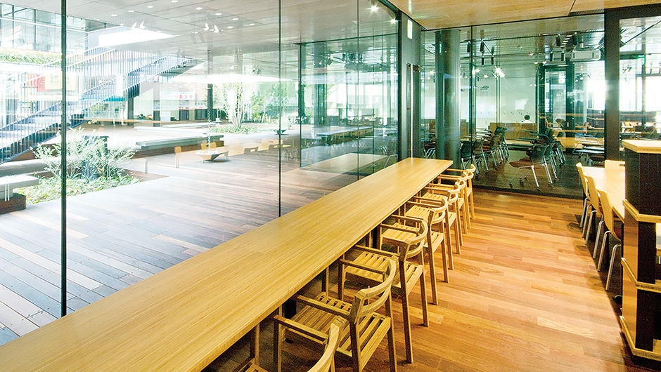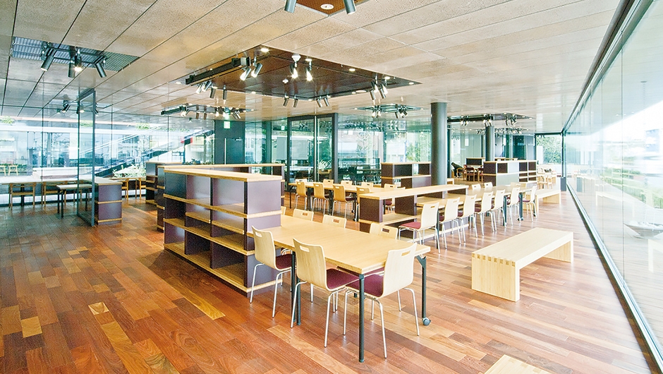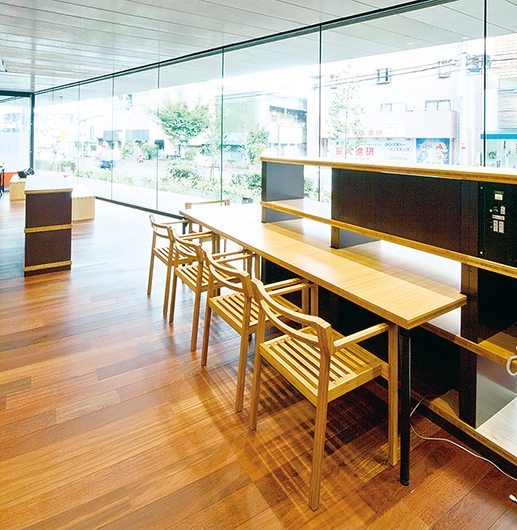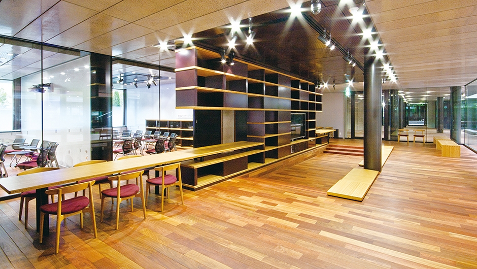 7i・ステーション〈1〉/イス:NDC特注品、ベンチ:特注品、テーブル:DTN特注品、ユニット書架:特注品