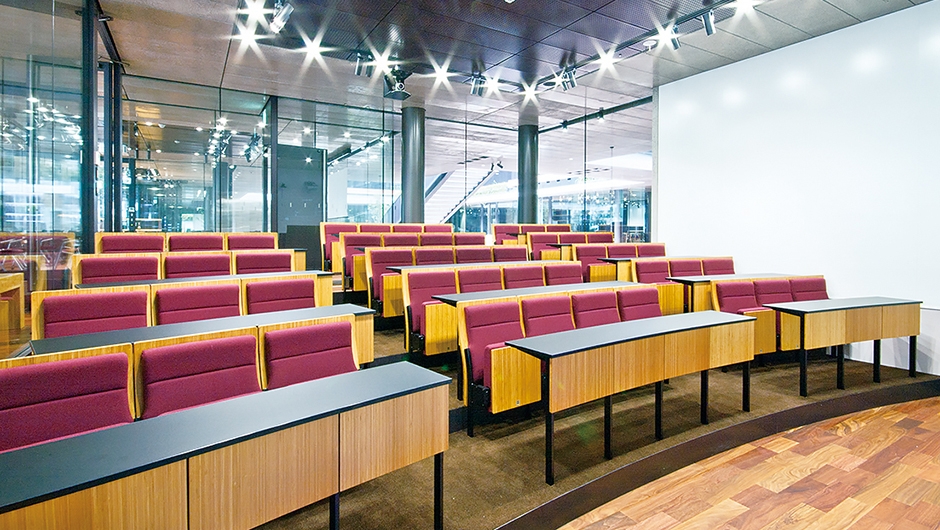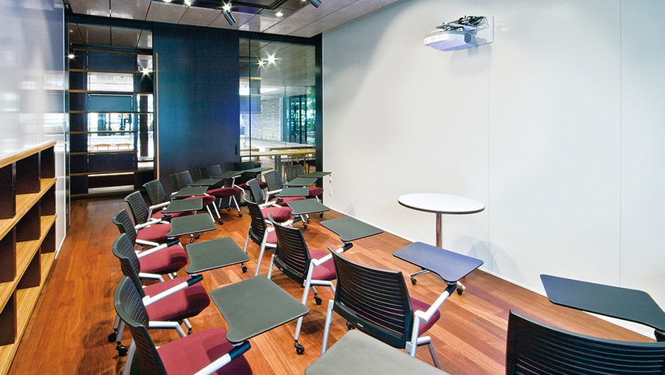 セミナールーム2/タブレット付イス:ビアネロ、上下式教卓:特注品、壁面書架:特注品
