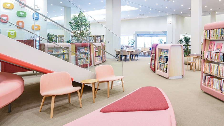 図書館には約5万冊の絵本が開架されているほか、書架はファブリックで覆われているなど子どもにも配慮された図書館となっています。また、多目的ホールには収納可能な移動観覧席が設置されており、発表会やイベントなど幅広い用途で利用することができます。